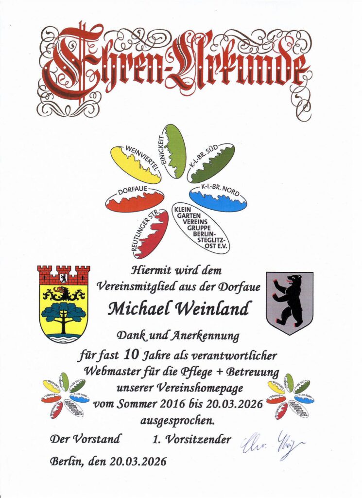 Der bisherige Webmaster wurde auf der Versammlung vom 1. Vorsitzenden mit einer Urkunde geehrt.